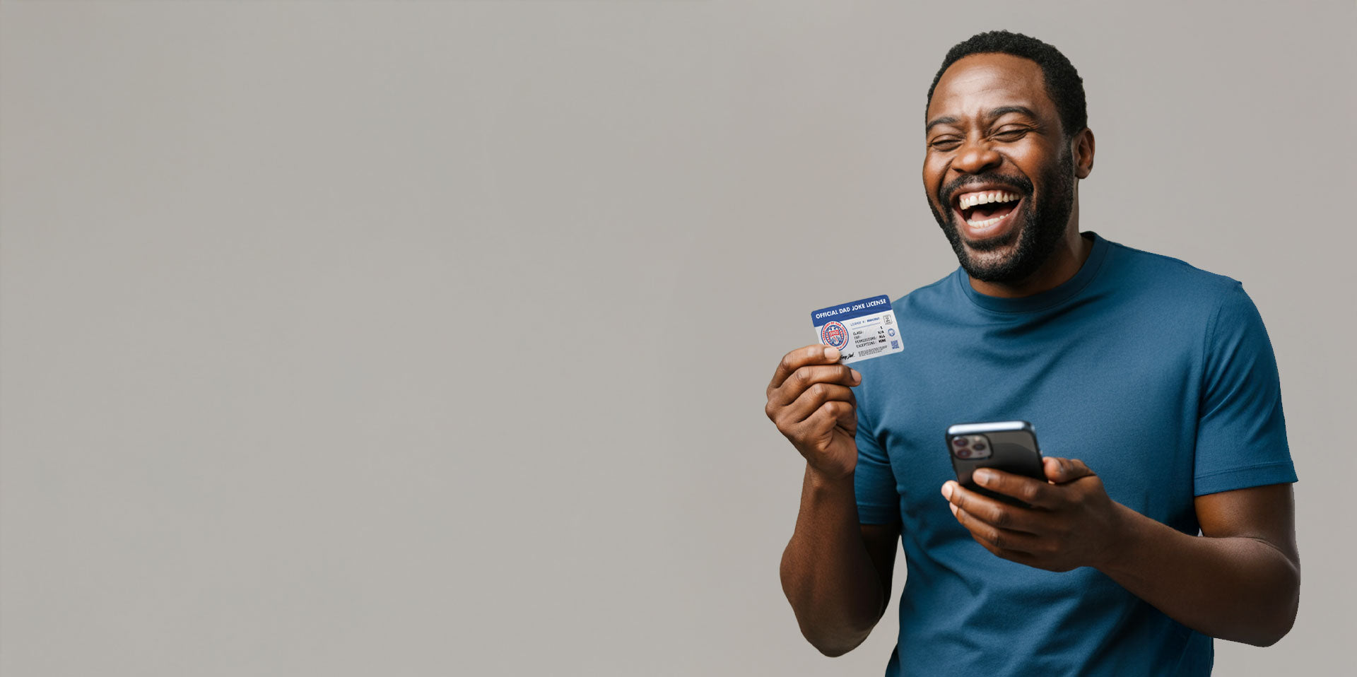 The Dad Joke License is embedded with an NFC chip. Think Tap-To-Pay with your debit card, but for dad jokes! Tap the phone to the top back of your phone and enjoy!