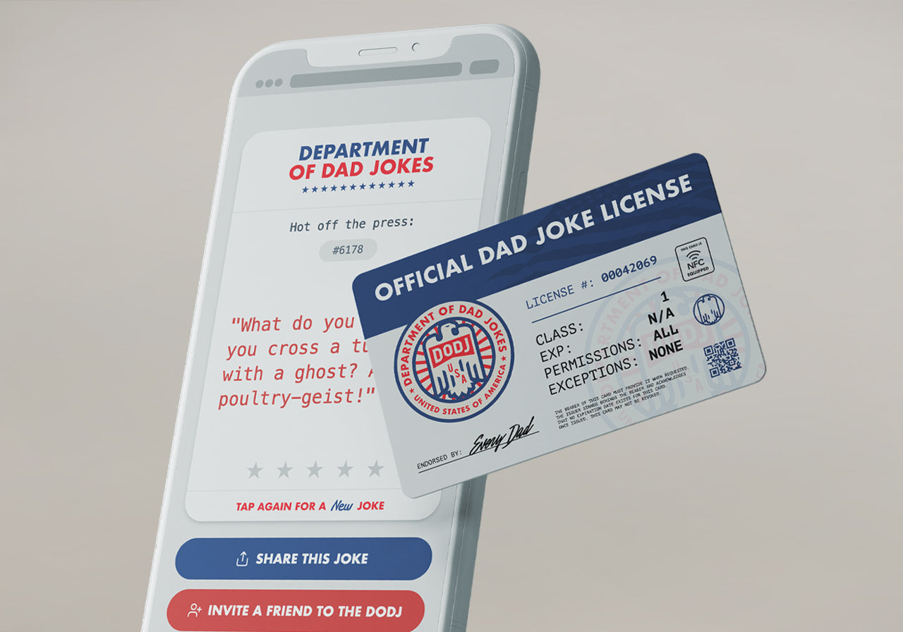 The Dad Joke License is embedded with an NFC chip. Think Tap-To-Pay with your debit card, but for dad jokes! Tap the phone to the top back of your phone and enjoy!